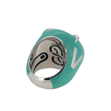 Giada incastonata e contornata di diamanti bianchi in un gambo prezioso in oro bianco con smalto turchese e la scritta LOVE.