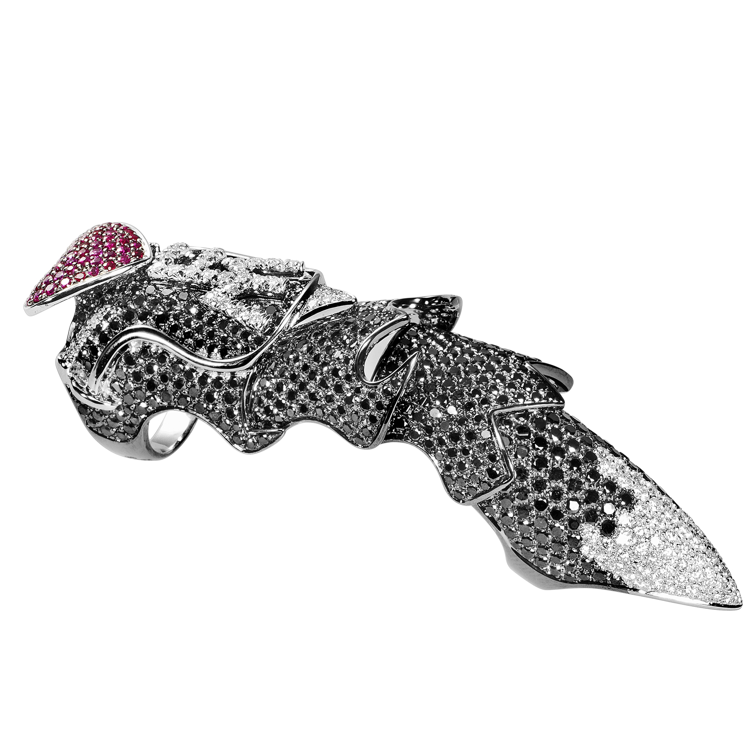 Un’armatura in oro bianco riproduce la forma dell’intero dito ricoperto di pavè di diamanti neri fino alla punta dove dei diamanti bianchi rappresentano un’unghia smaltata.