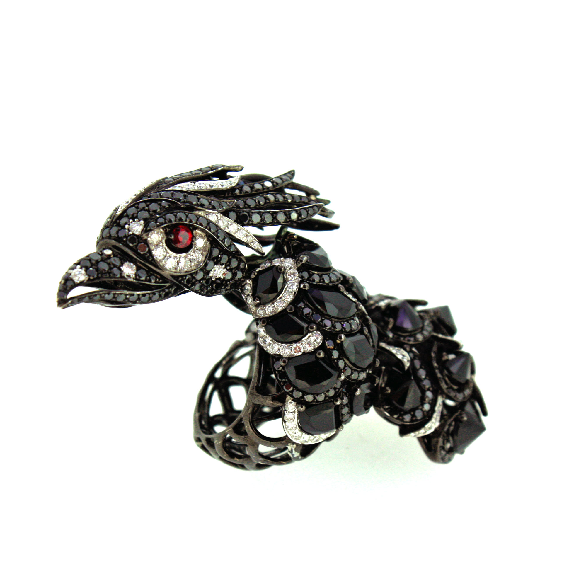 The imposing beauty of the phoenix, or firebird, and its mythological history exalt the dream of immortality and foresight, well expressed by the skillful combination of precious stones and colored gems.