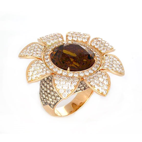 A precious daisy blooms between white diamonds, brown diamond and cognac quartz.