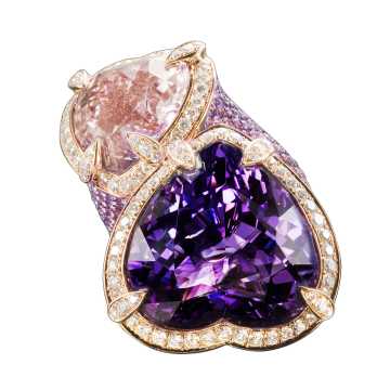 - Central stones: light and dark heart shape cut amethystes.