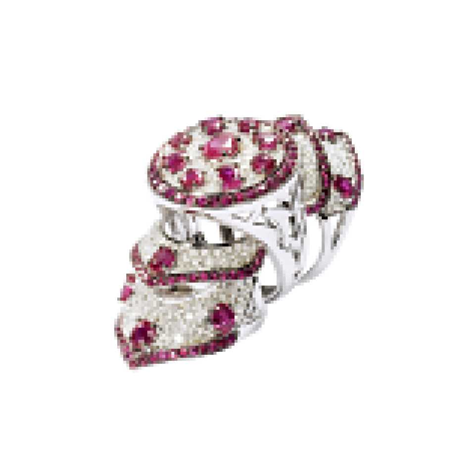 Ring inspired by the style of oriental armor, it bends leaving fingers free. Composed of white gold, diamonds and emeralds.
