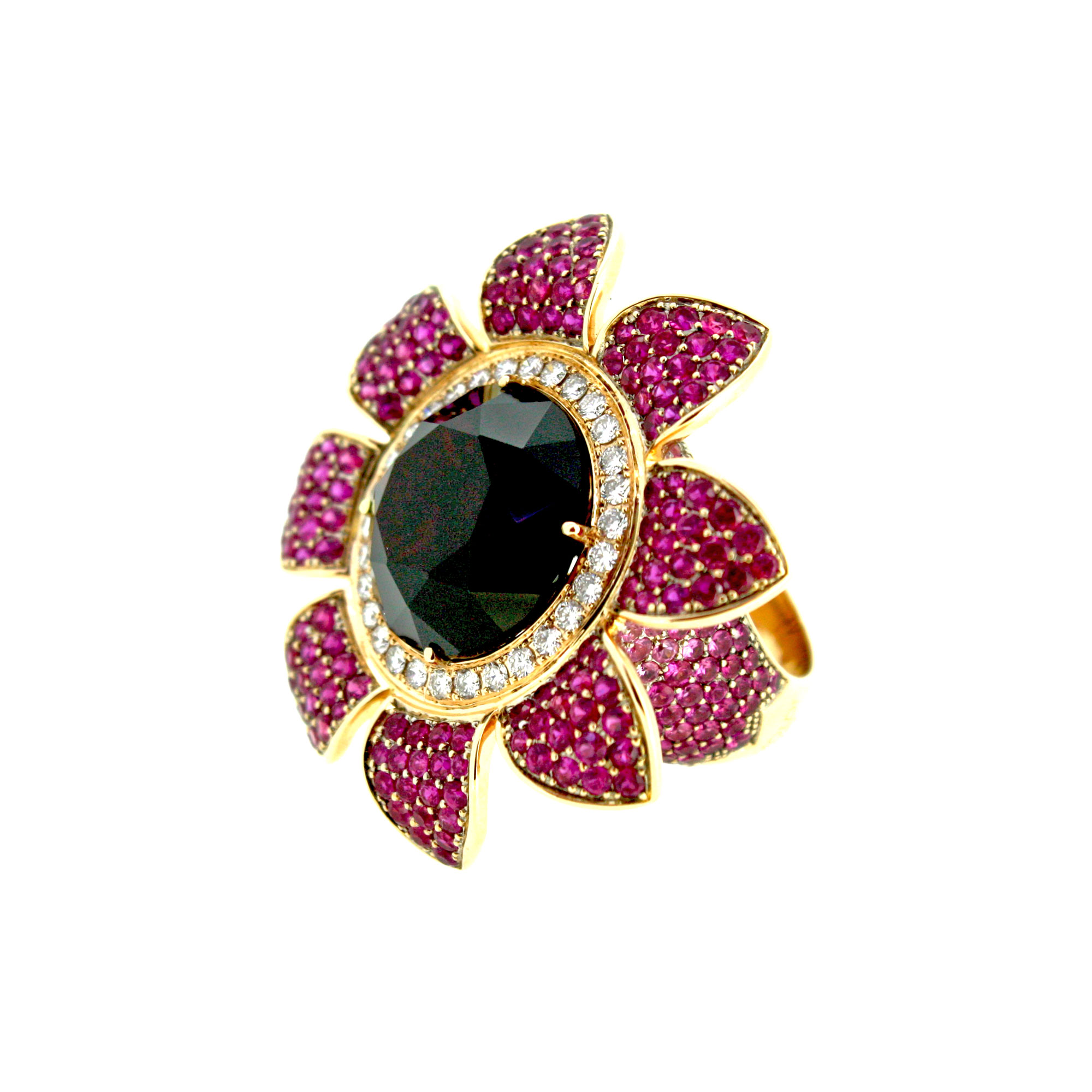 A precious daisy bloom between diamonds, rose sapphieres and rubies.